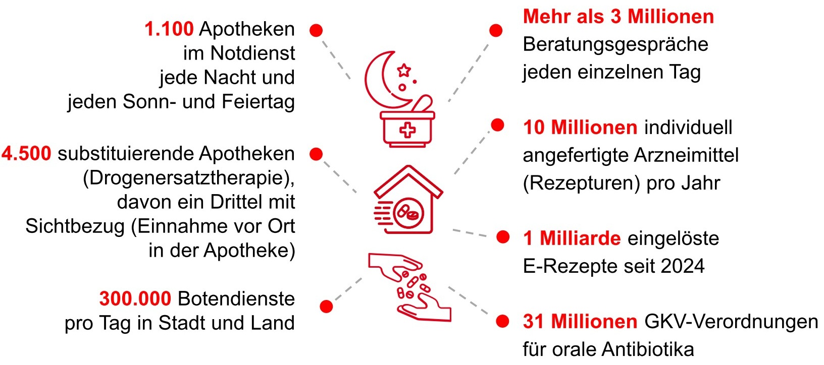 Die Apotheken vor Ort haben seit 2024 etwa eine Milliarde E-Rezepte eingelöst und sind eine zentrale, unverzichtbare Säule in der ambulanten Gesundheitsversorgung der Bevölkerung. Hierzu gehören zum Beispiel die umfassende, kompetente Beratung zur korrekten Anwendung von Medikamenten sowie Nacht- und Notdienste an Wochenenden und Feiertagen. Die Lieferung von Arzneimitteln und anderen Apothekenprodukten bis an die Haustür ist vor allem für kranke oder ältere Patienten und außerhalb der Großstädte eine große Hilfe im Alltag. Wann immer es kein geeignetes Fertigarzneimittel gibt, stellt zudem grundsätzliche jede Apotheke sogenannte Rezepturen her; dabei handelt es sich um individuell gefertigte Medikamente, die genau auf den jeweiligen Therapiebedarf abgestimmt sind. Manche Apotheken sind auch spezialisierte Anlaufstellen für die Drogenersatztherapie, teilweise sogar mit Sichtbezug. Das heißt, das pharmazeutische Team gibt die Substitutionsmittel nur zur unmittelbaren, kontrollierten Einnahme vor Ort aus.